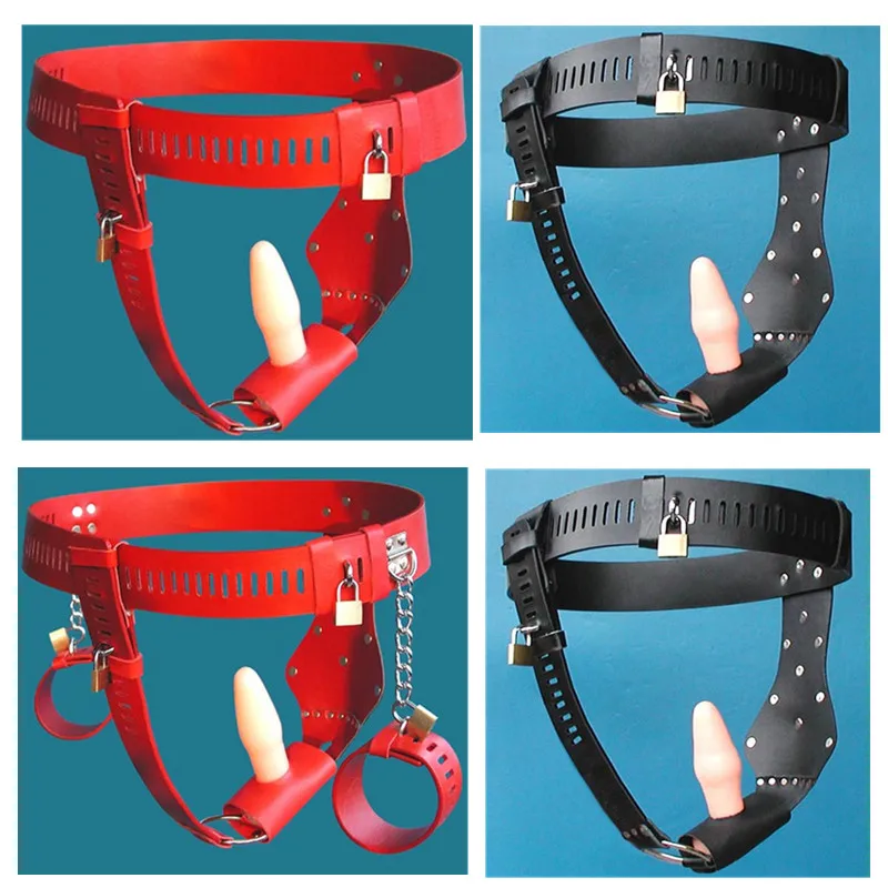 Black Red Chastity Belts Bondage Kits PU Female Chastity Device Hand Cuffs with Anal Plug Handcuffs look the best product that related to